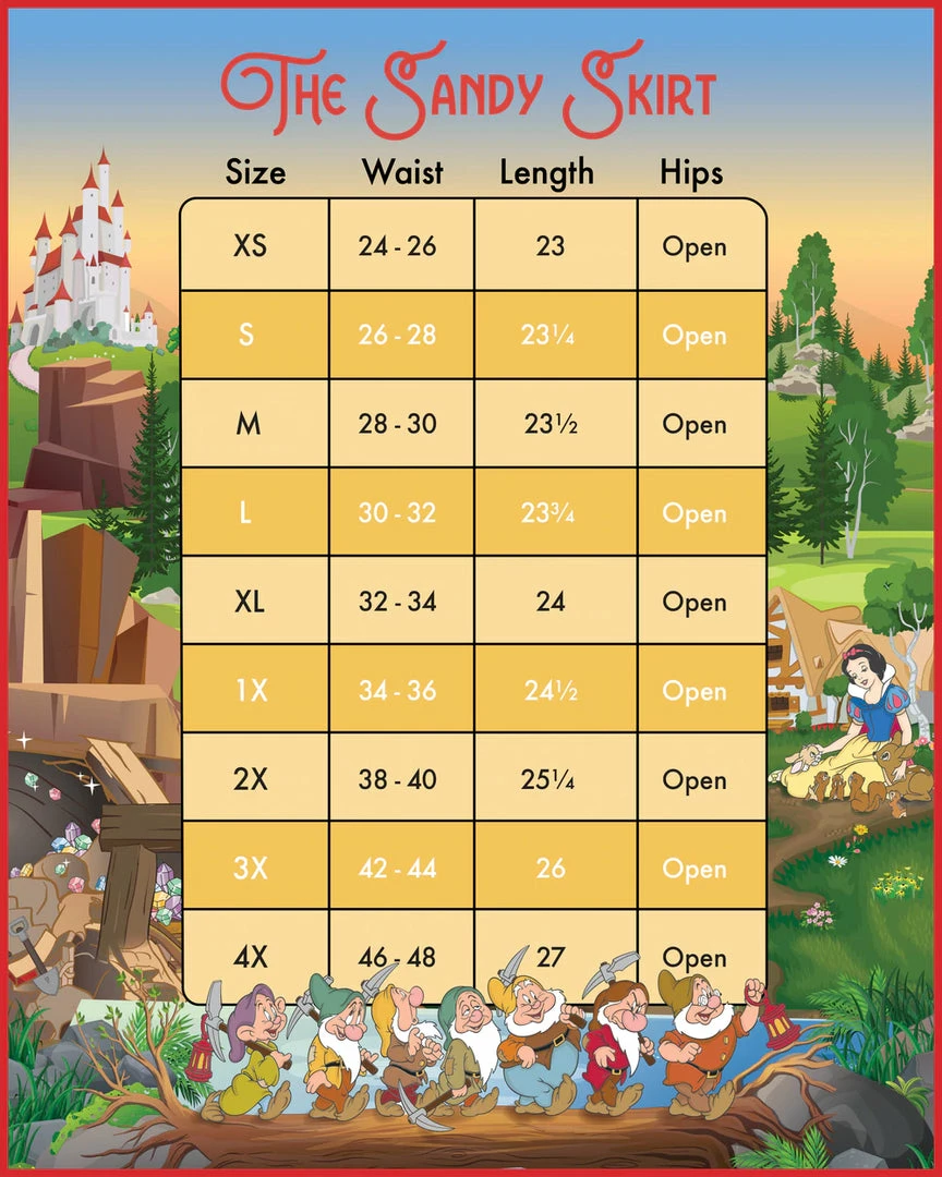 This Sandy style skirt is made of super soft stretch sateen (97% cotton/3% spandex). Hitting just at the knee on most, the Disney โWith a Smile and a Songโ Sandy Skirt features a zipper back, pockets, elastic waist band (for extra comfort), and a button closure. This versatile skirt can easily be paired with tees, blouses, sweaters, and more to dress it up or down.