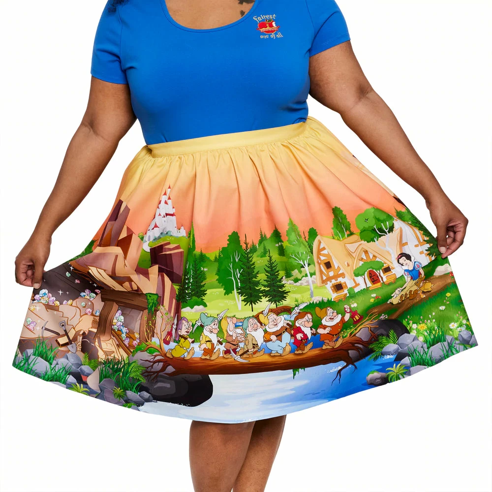 โWith a Smile and a Song,โ Snow White finds comfort and brings cheer to the Seven Dwarfs. Bring the same charm and effortless style into your wardrobe by wearing the Stitch Shoppe Snow White Sandy Skirt. Against a backdrop of a glorious sunlit sky, the Seven Dwarfs leave the diamond mines, crossing a log, which spans a gentle brook. Snow White waits by their cottage, surrounded by fields and flowers. Along the waistband, an embroidered message reads โWith a Smile and a Song.โ